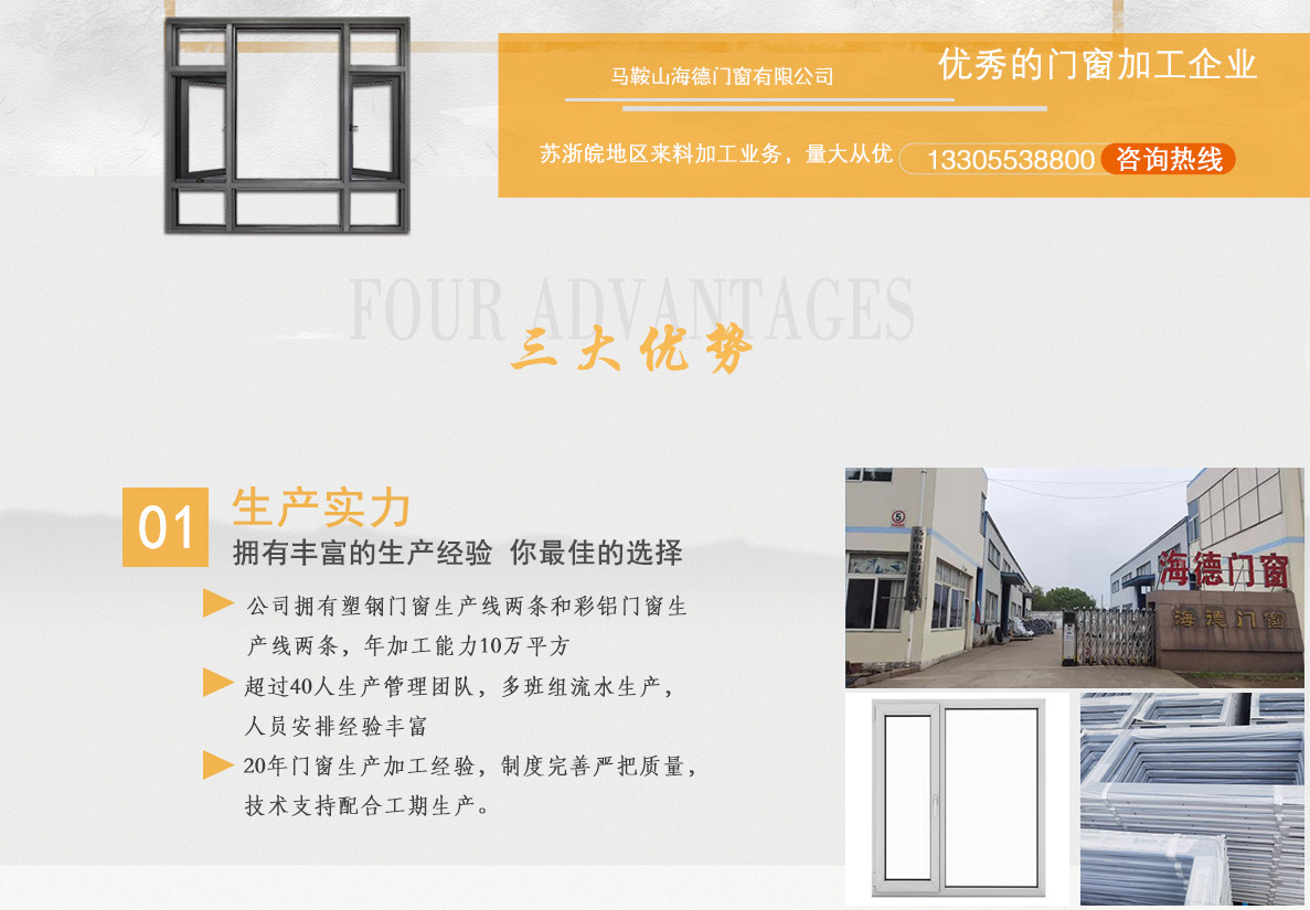 關(guān)于我們馬鞍山海德門窗有限公司是一家主營(yíng)門窗加工的公司,公司主要從事塑鋼門窗、彩鋁門窗、鋁合金陽臺(tái)欄桿、鋁合金百葉窗的生產(chǎn)加工。擁有一批熟練的技術(shù)工人和設(shè)計(jì)人員,有著20多年的門窗加工制造經(jīng)驗(yàn)。現(xiàn)擁有2條塑鋼門窗生產(chǎn)線和2條彩鋁門窗生產(chǎn)線,1年加工門窗十萬平方米。公司坐落在馬鞍山國(guó)家經(jīng)濟(jì)技術(shù)開發(fā)區(qū),距離馬鞍山高速公路南出口僅3公里,已多次承接了大型門窗來料加工的業(yè)務(wù),受到客戶的一致好評(píng)。隨著市場(chǎng)的發(fā)展和公司的定位,公司愿大量承接蘇浙皖及周邊地區(qū)的門窗來料加工業(yè)務(wù)。隨時(shí)歡迎各新老客戶的來電咨詢及上門參觀洽談,客戶的滿意是海德門窗進(jìn)步前行的動(dòng)力。